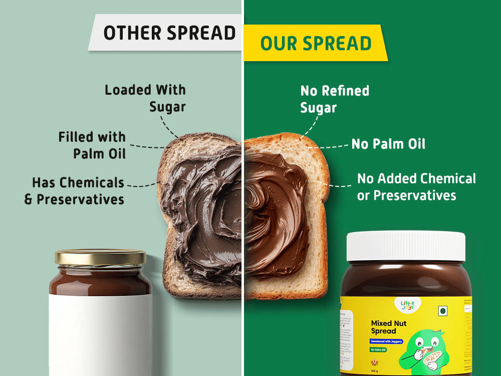 Little Joys Chocolate Hazelnut Spread and Little Joys Chocolate Mixed Nut Spread use nuts as the primary ingredient with natural cocoa and no added refined sugar - no palm oil, no artificial flavouring. For children who eat chocolate spread regularly, this is the appropriate daily-use format.