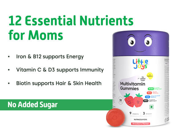 Little Joys Mom's Multivitamin addresses iron, B12, D3, folate, biotin, Vitamin C, and zinc in one daily gummy. Zero added sugar, chicory root prebiotic base for gut health during a period when digestive changes are common. Plant-based, GMP certified, third-party tested.