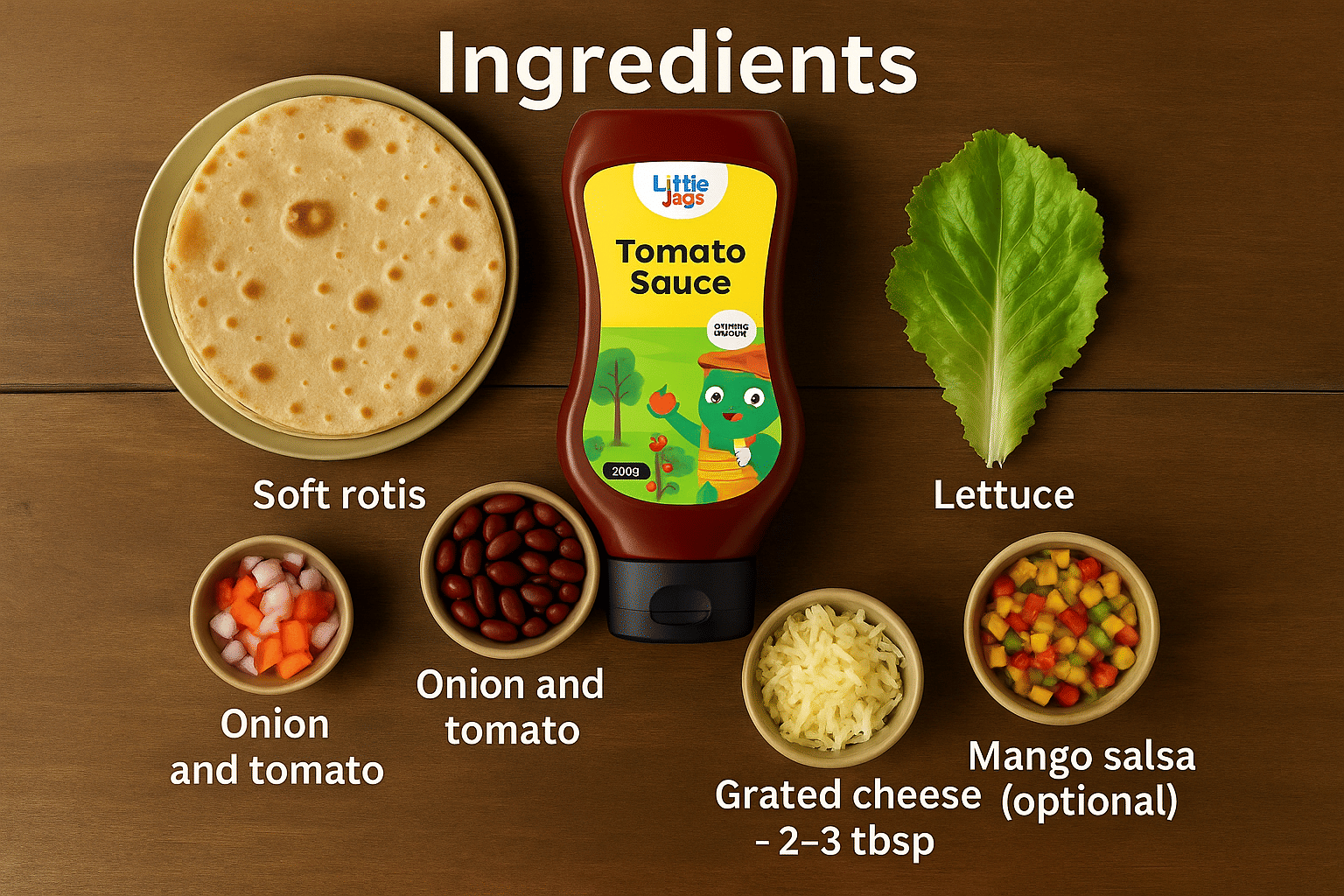 - Little Joys Tomato Sauce – 1 tsp for roti base, 2 tbsp for filling