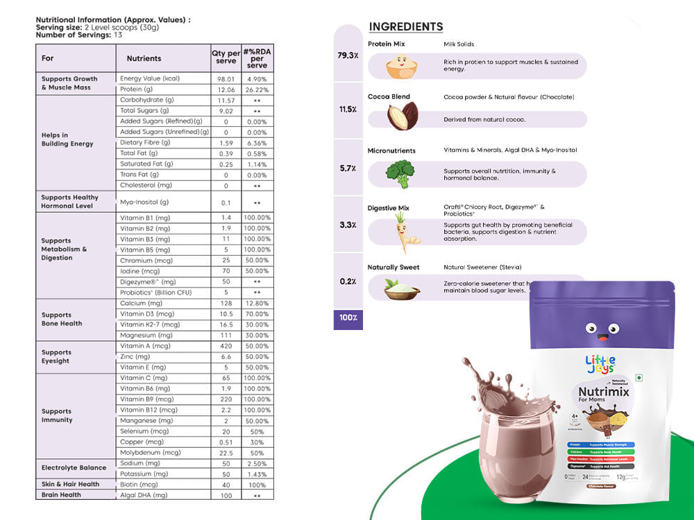 Our nutritionists say: Calcium is a must for every mother over 30. Absorption of calcium becomes difficult with age and highly common deficiency of Vitamin D3 leading to weak bones and muscle pain.